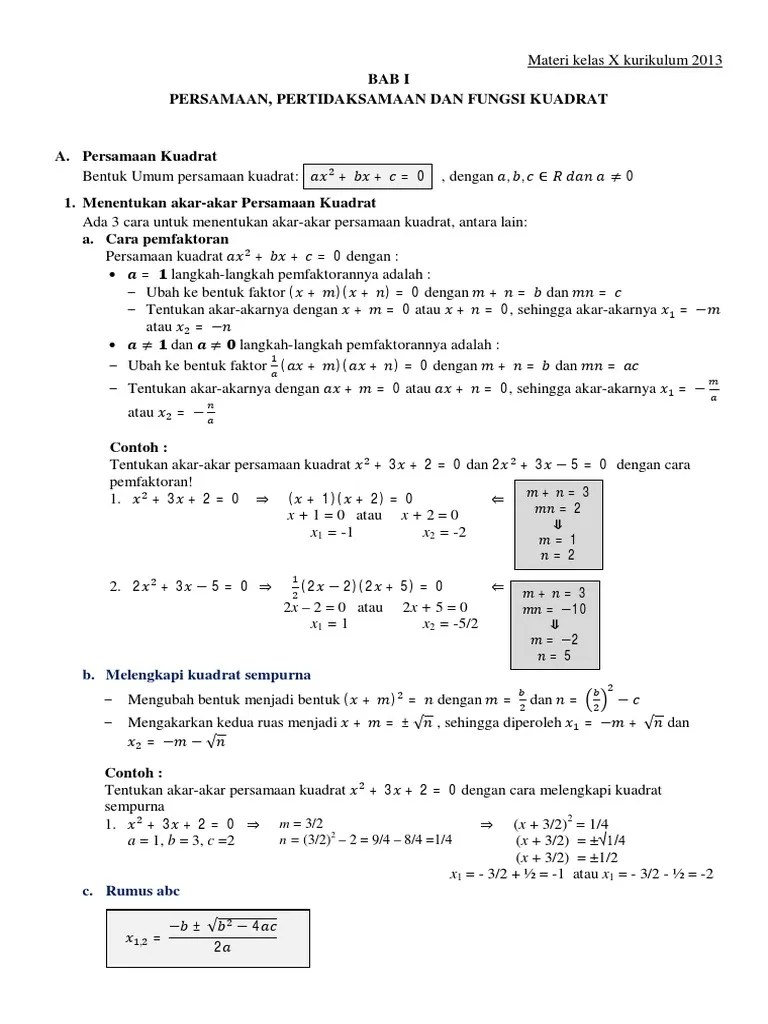 Rangkuman materi bab persamaan kuadrat disertai contoh soal dan jawaban dengan pembahasan.